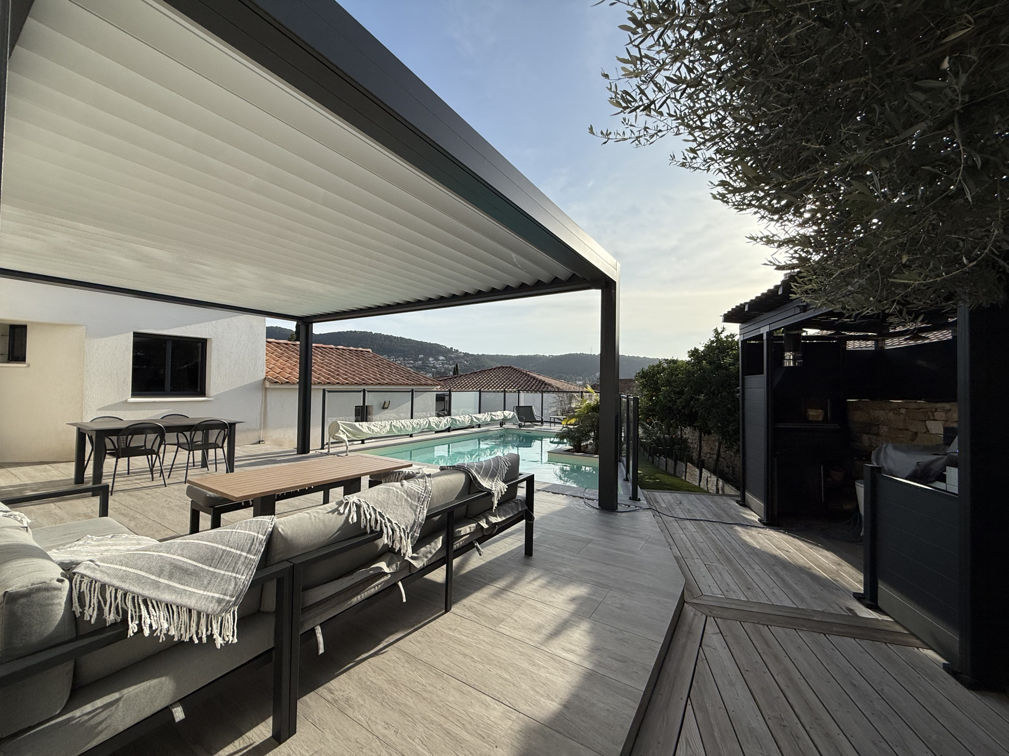 Le séjour se prolonge naturellement vers une vaste terrasse exposée SUD-EST, véritable espace de vie à ciel ouvert. Protégée par une pergola bioclimatique motorisée à lames orientables, elle accueille une piscine élégamment intégrée, idéale pour partager des moments privilégiés en toute intimité, au fil des saisons.