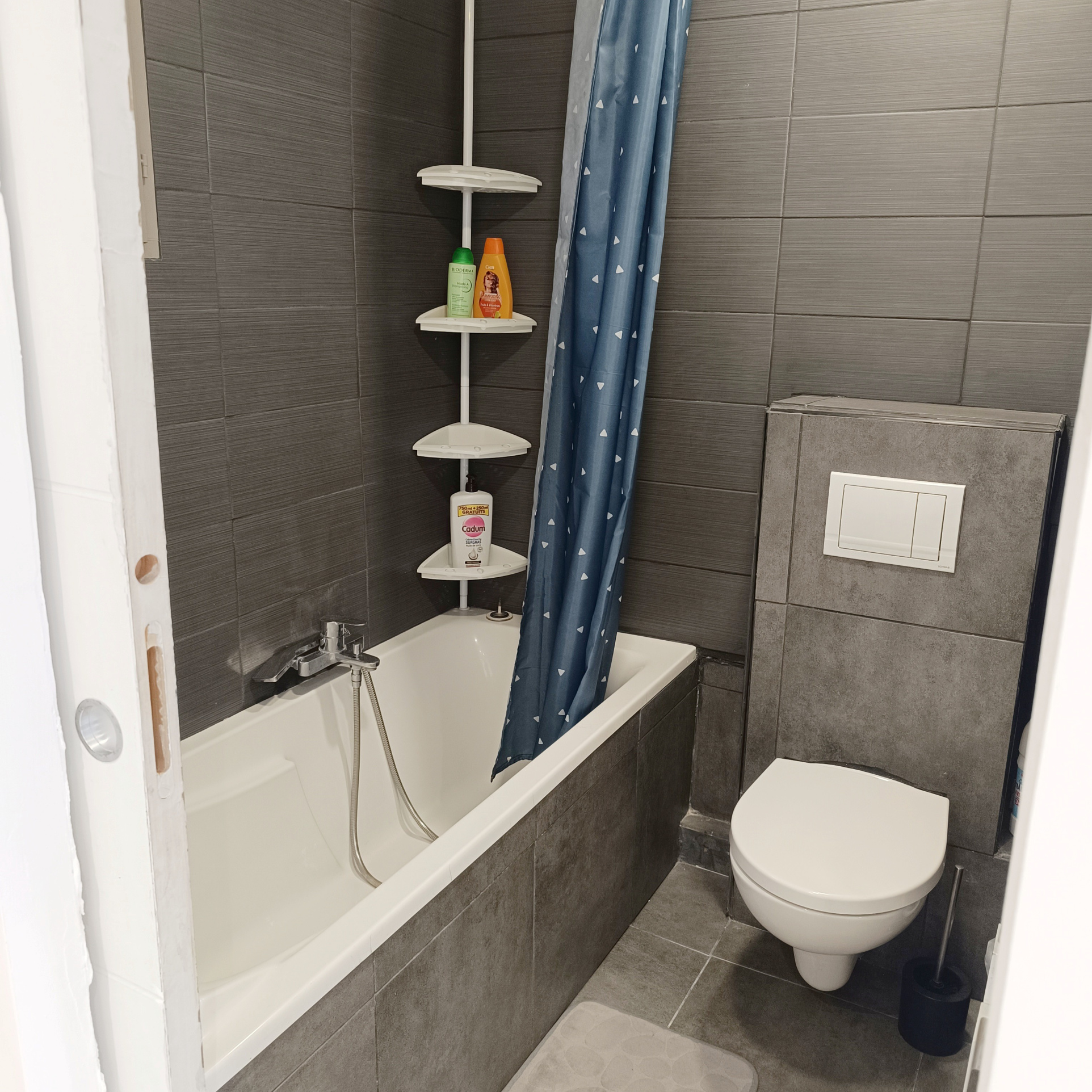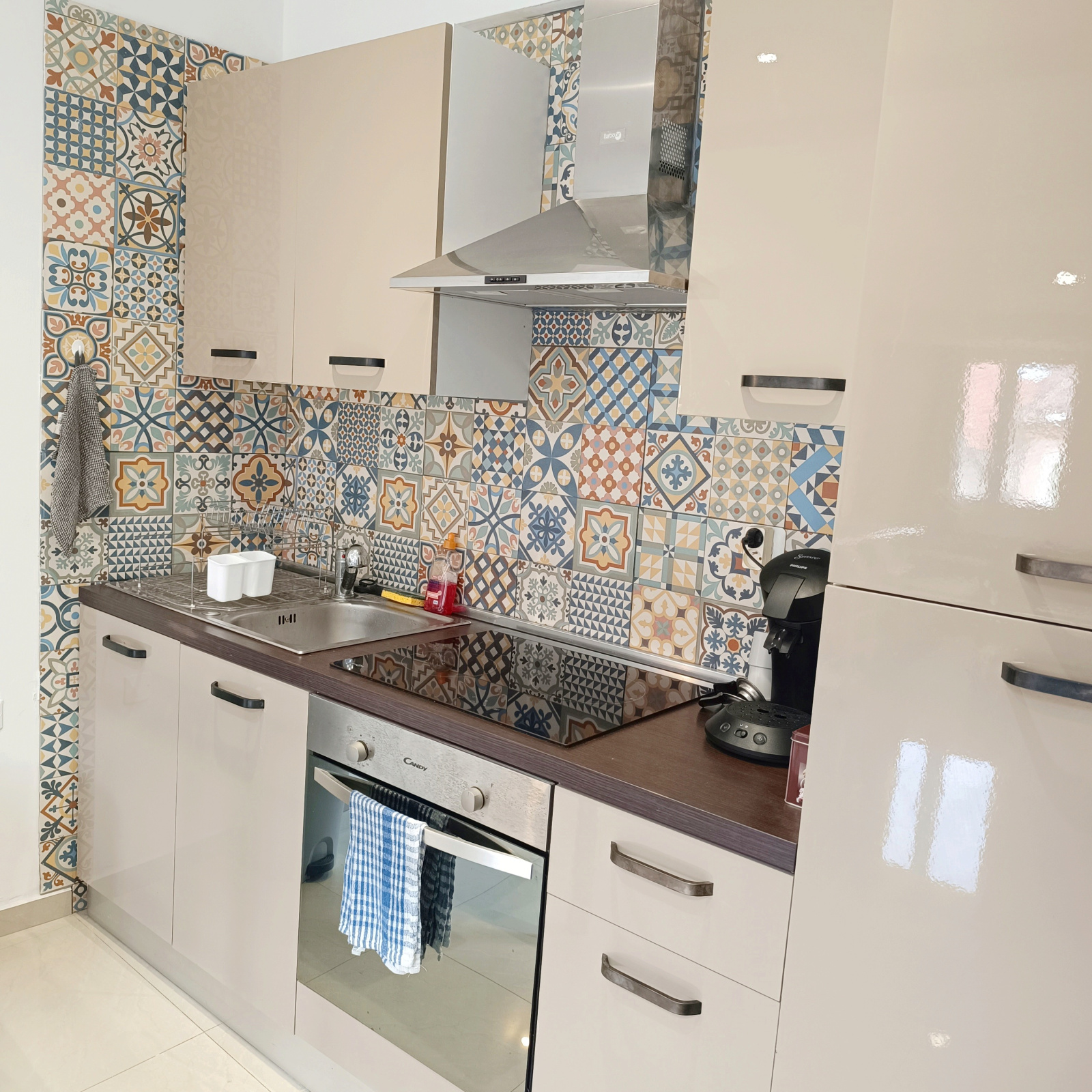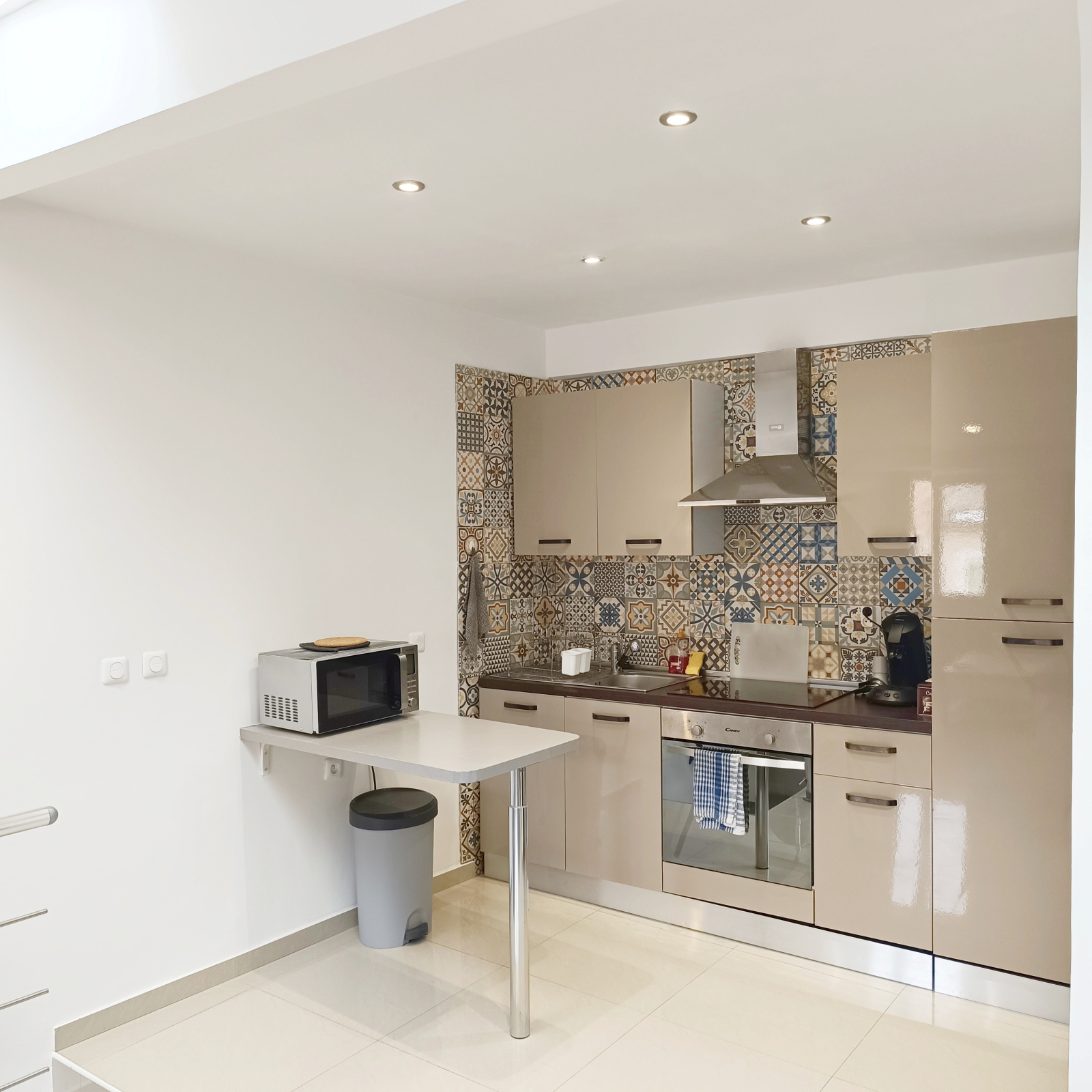 La cuisine, moderne et parfaitement équipée, se distingue par ses finitions soignées et son originalité, notamment grâce à une crédence en carreaux de ciment. Une salle d’eau fonctionnelle complète l’ensemble.