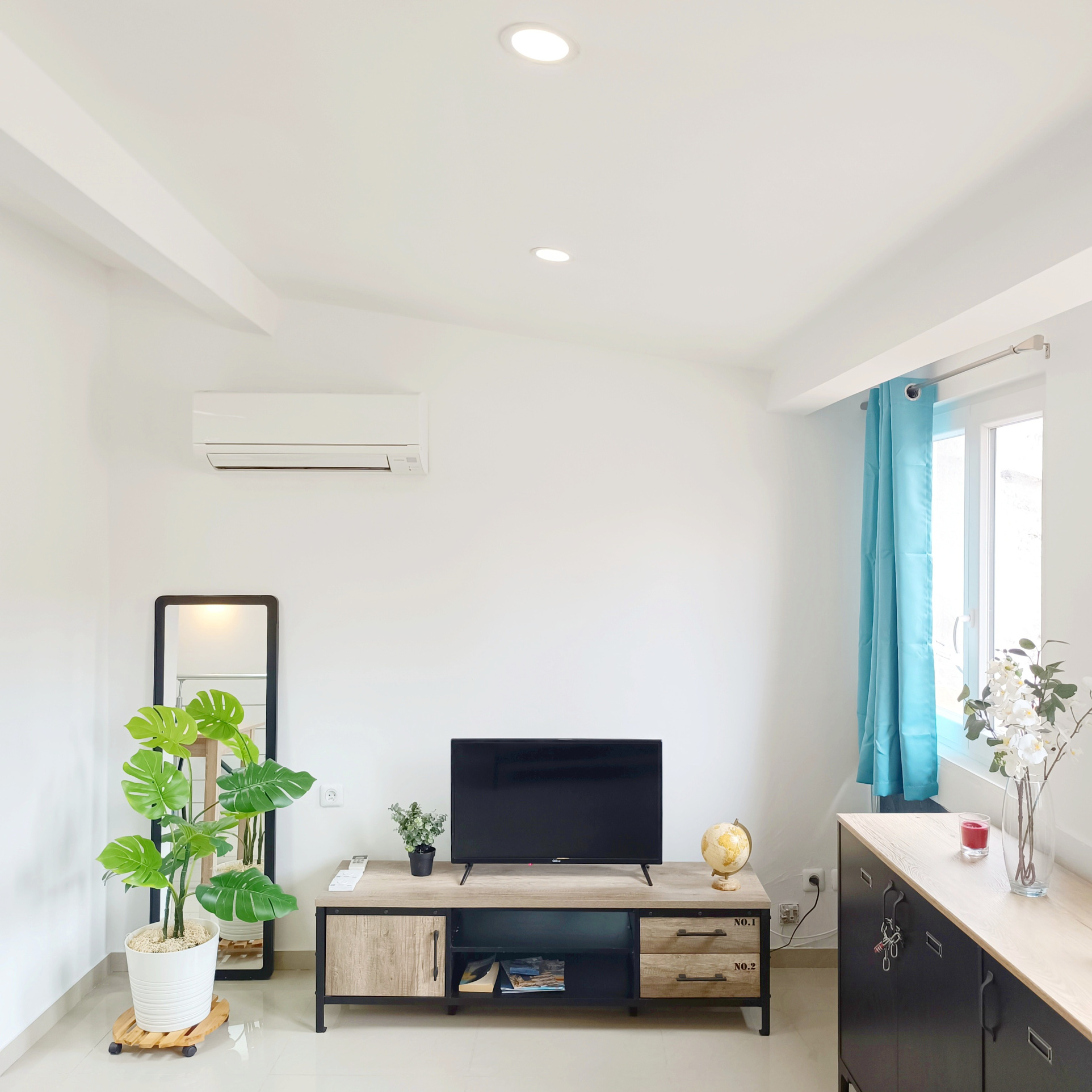 Inondé de lumière grâce à ses larges ouvertures et deux Velux électriques au plafond, l’espace de vie séduit par son atmosphère chaleureuse et contemporaine. La pièce principale, décorée avec goût, intègre un salon confortable et un espace repas convivial. L’appartement est équipé d’une climatisation réversible récente, garantissant un confort optimal en toutes saisons.