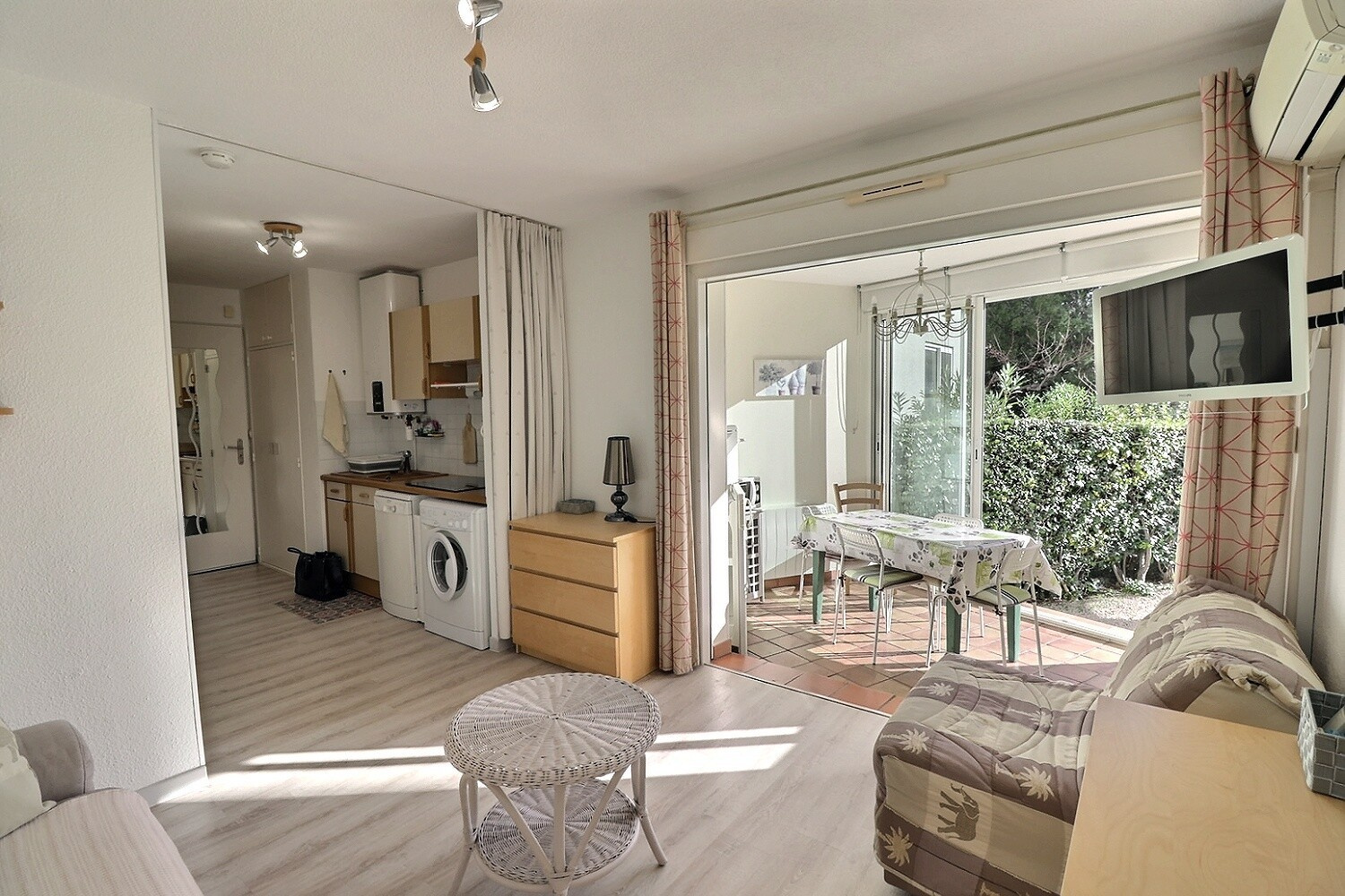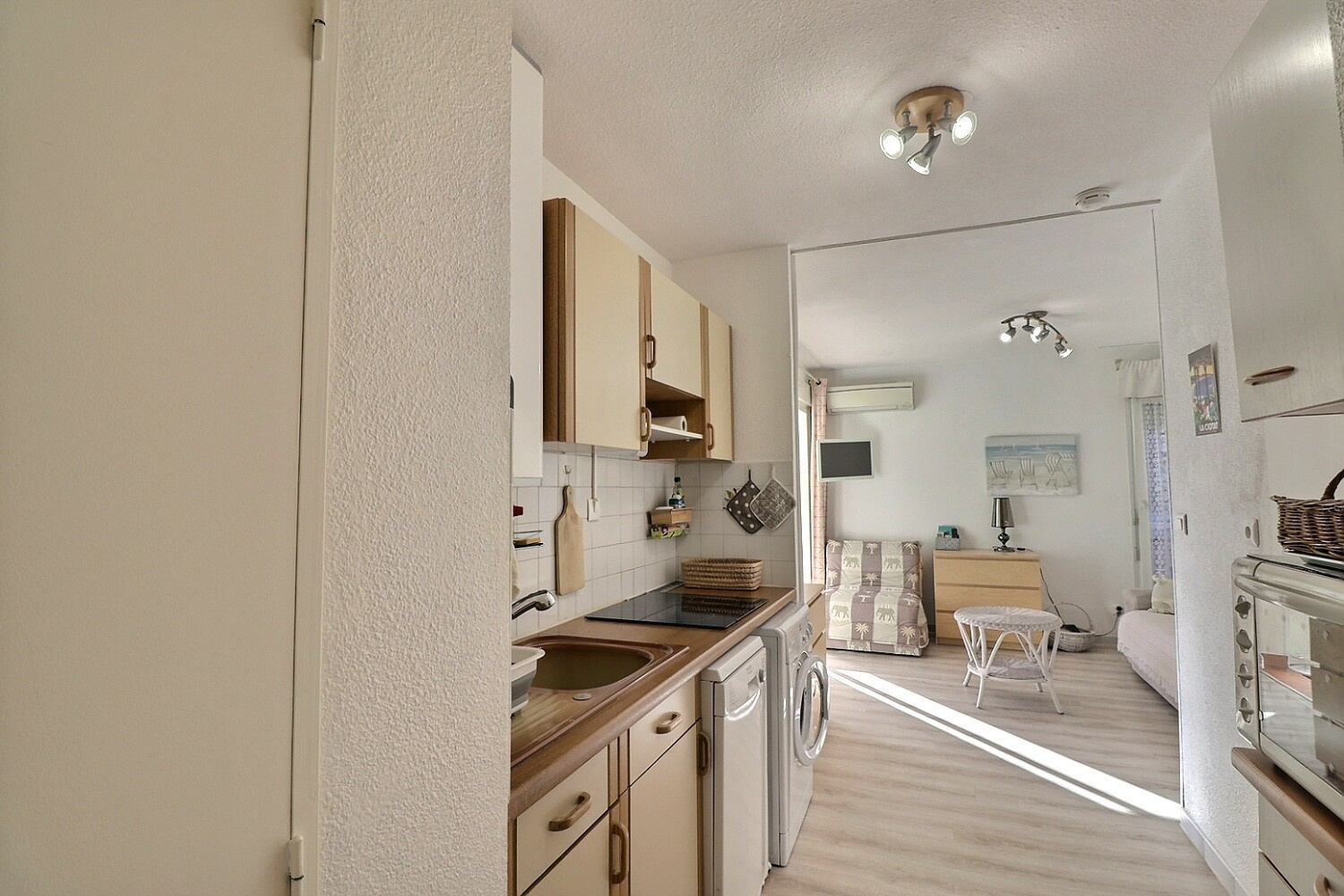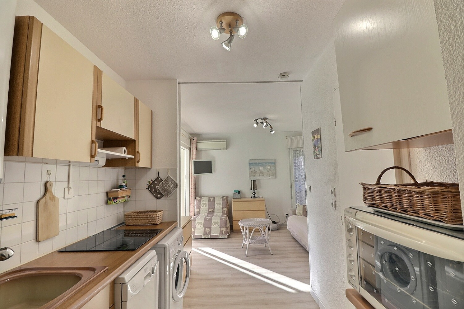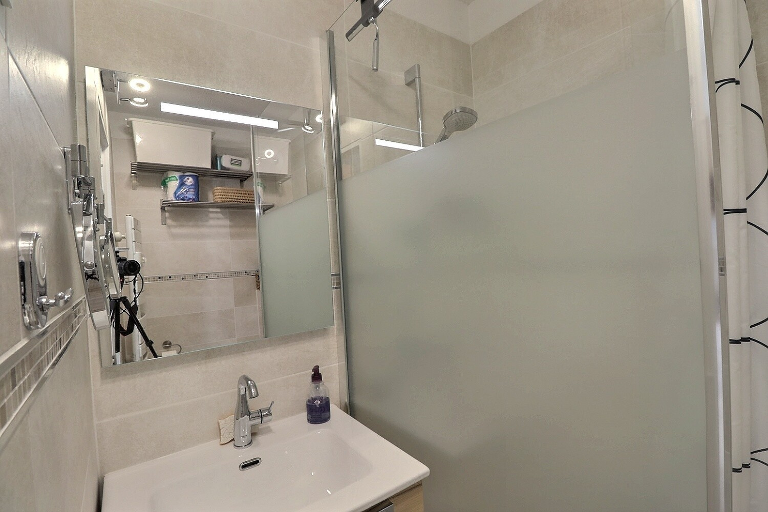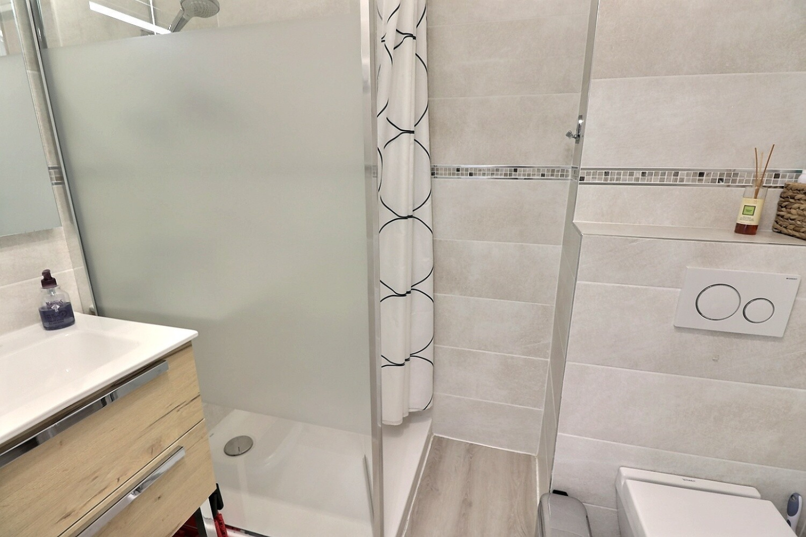 La salle d’eau a également été rénovée récemment, avec une douche contemporaine, WC suspendu, sèche-serviette et chauffe-eau extra-plat, alliant confort et esthétique. Pour compléter le confort, l’appartement est équipé d’une climatisation, garantissant une température agréable en toutes saisons.