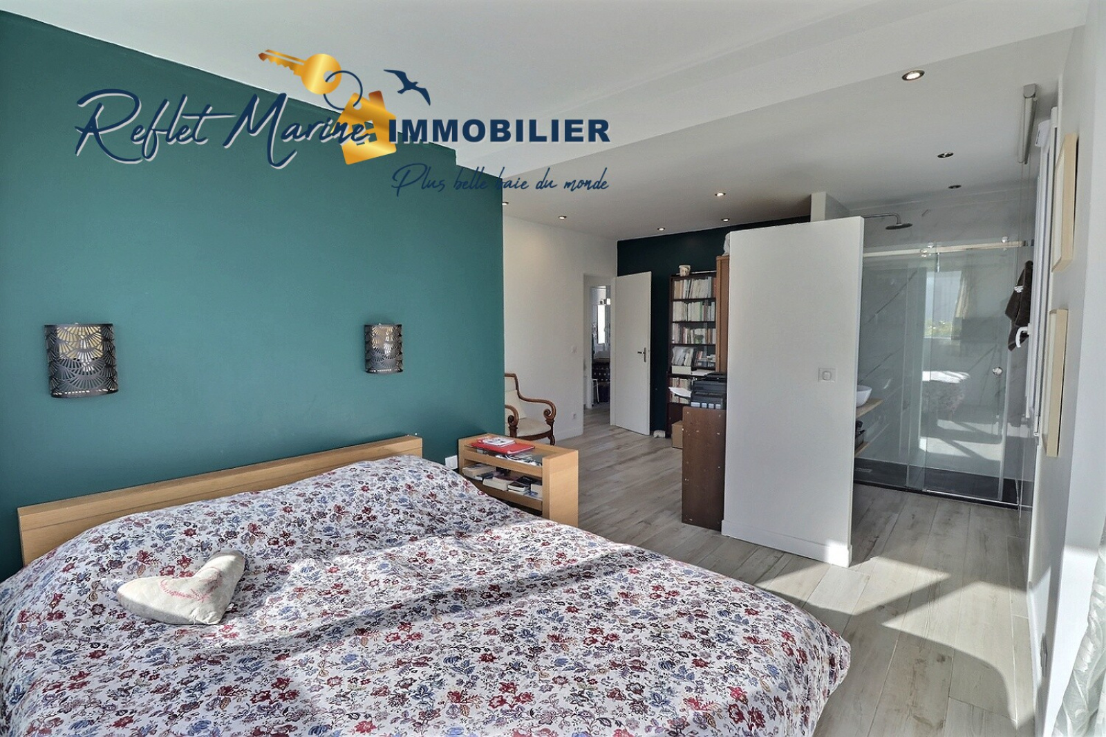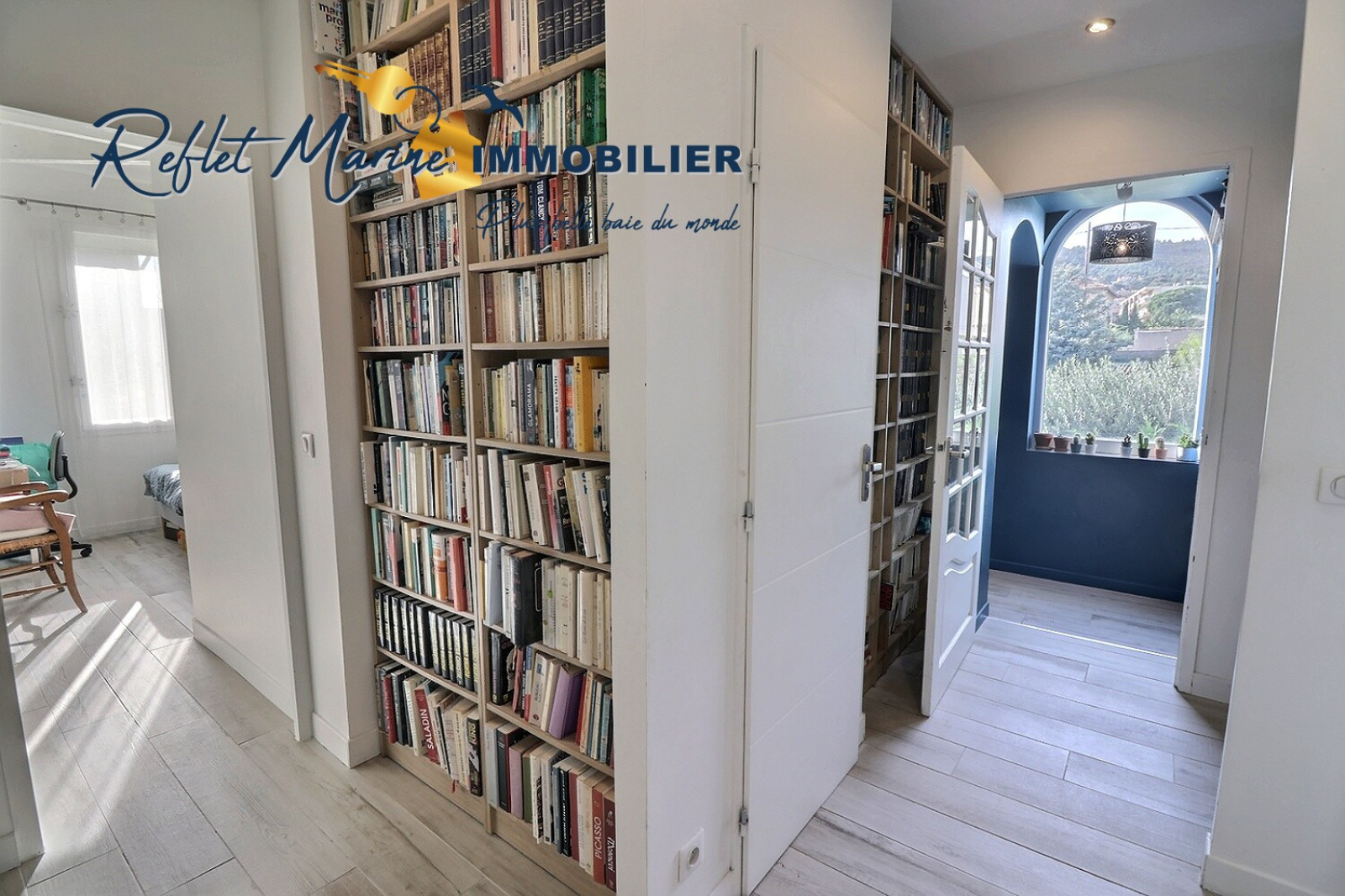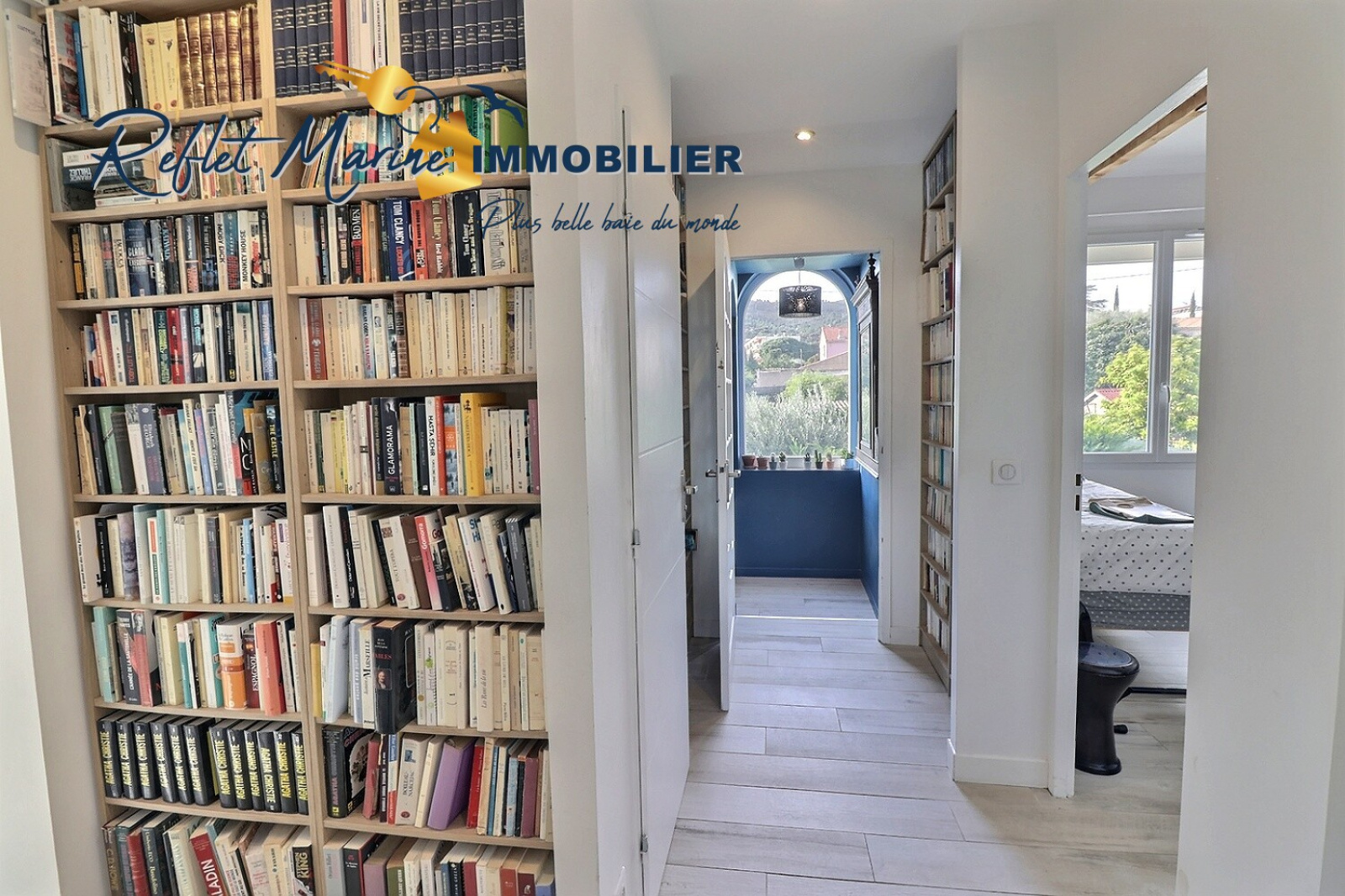 Un dégagement agrémenté d’une bibliothèque et un couloir à la décoration originale apportent une touche de caractère et d’âme à l’étage.