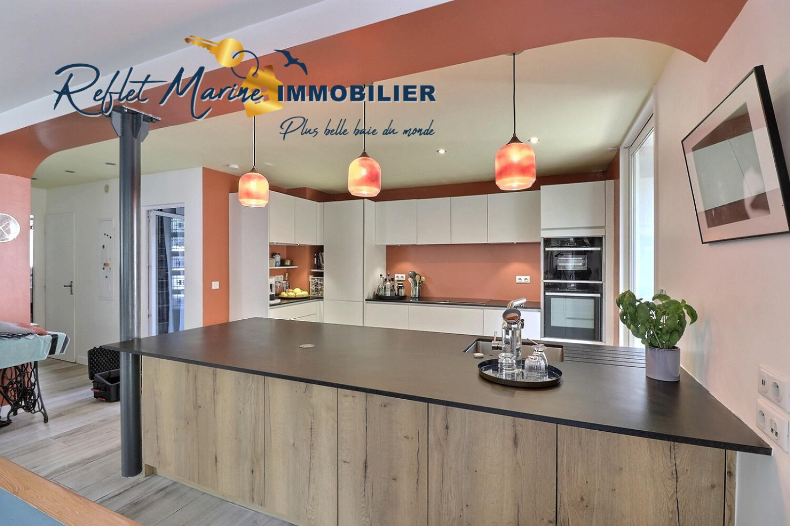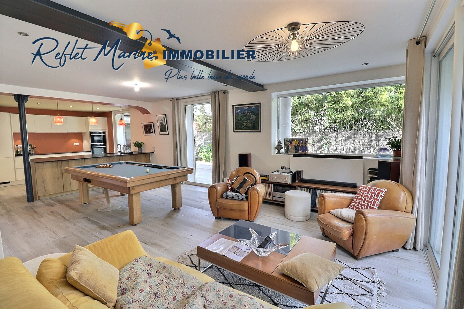 La cuisine contemporaine ouverte, avec îlot central, s’intègre harmonieusement à cet espace convivial, pensé pour recevoir et partager.