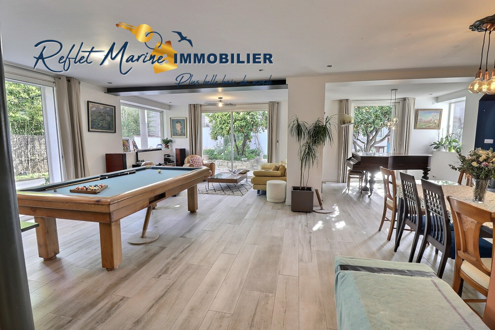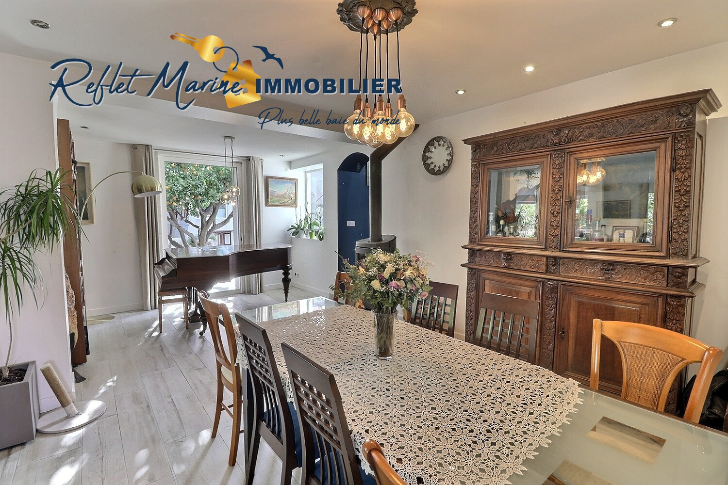 La pièce de vie, particulièrement lumineuse et chaleureuse, s’ouvre sur un extérieur intimiste, composé de terrasses, d’un espace détente estival et de beaux arbres fruitiers, une joile PISCINE avec un salon d'été ombragé, créant une atmosphère paisible en plein centre-ville.