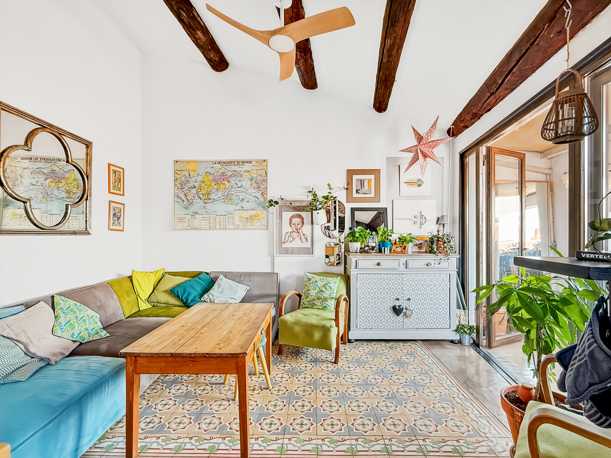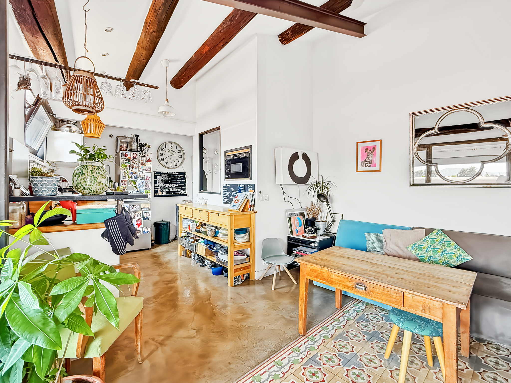 Un espace de vie lumineux comprenant un salon et une cuisine aménagée et équipée,