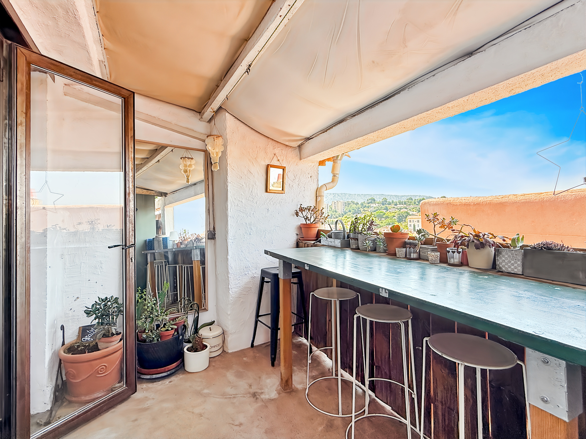 Accès direct à une magnifique terrasse de 13 m² offrant une vue dégagée sur les toits de la ville et le clocher